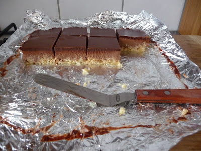 Finally, once your filling is set, you can melt together the topping ingredients using your preferred method, though it will obviously not take as long, and then pour glossily over your slice. Be very careful when spreading this out, and try to touch it as little as possible to it stays gorgeous and glossy. Now it just needs to set for another half an hour or so, and then cut into squares, four down four accross and share….or not.