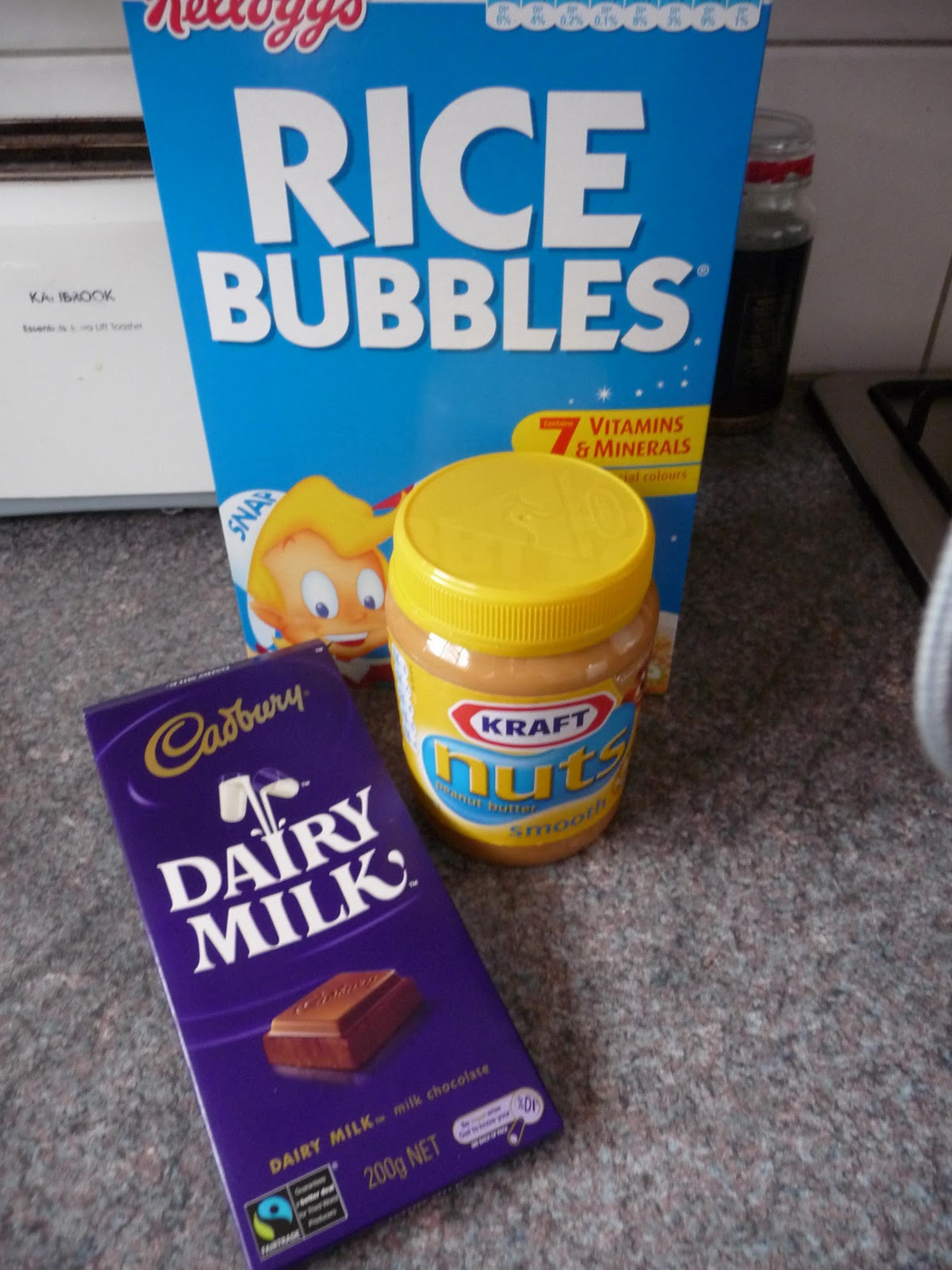 First line a 20cm square pan, or a similar sized circular or rectangular one, with foil and lightly grease the pan with flavourless oil or butter. Put your rice cereal in a large bowl and set aside, then combine in a small saucepan your water, sugar and syrup, and stir together gently, so that it does not splash the sides of the pan. Place the pan on a medium-high heat and wait until it begins to bubble vociferously and look syrupy, as opposed to liquid. Mine took about 3 to 5 minutes. If you have a sugar thermometer you can use that, you are looking for the soft ball stage or 110 C/235 F.