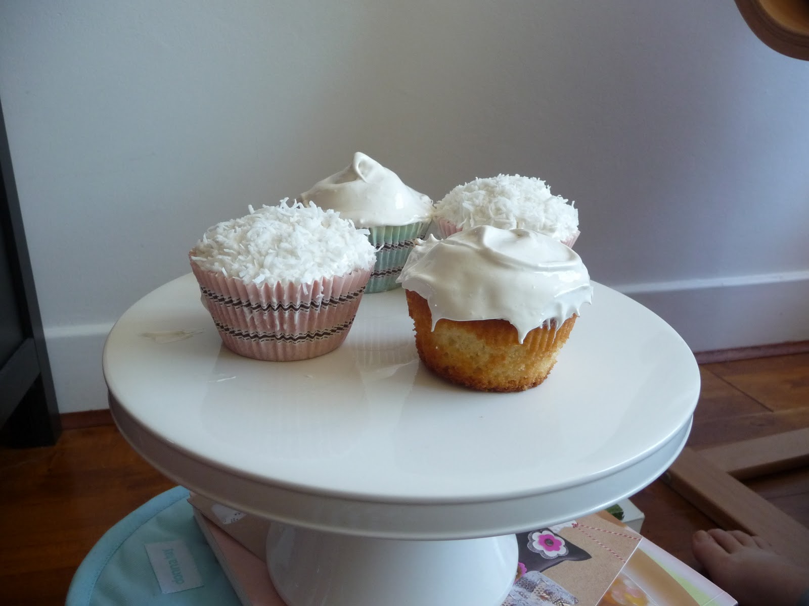 Anyway, I have not given a recipe here for the cake or curd sections of this confection, because store bought lemon curd will do just fine, and any old vanilla-y cupcake will do. I was happy with this one at the time, but now that I think about it…it could have been lighter. I will work on it and keep you posted. The real clincher on the cupcake front here is this icing. SWEET SUGAR, the icing. I tell you, a lighter, more ethereal, more beautiful icing you ain’t never seen. So I set it forth here in type, that it may bring joy to many more than just my greedy self. I also reccomend colouring it, because it gets the most amazing, beautiful metallic shine. Pearlescent, I want to say. Anyhoo, in the States they call this a Seven Minute Frosting, though I have adapted my recipe from a favourite Nigella Book of mine, FEAST. So, if this one deosn’t work for you, that’s what you should google, although I have to say this is the easiest version I’ve found.
