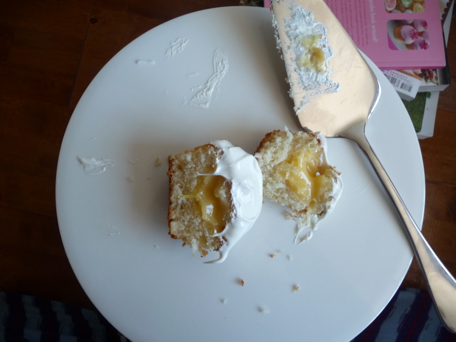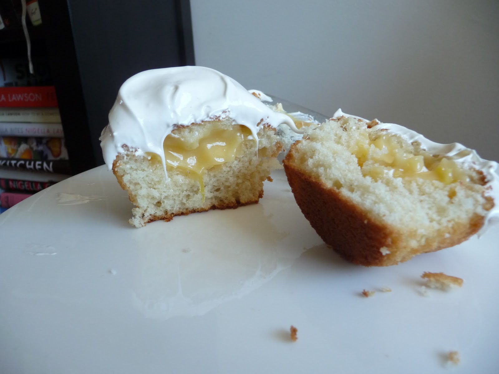 So anyway literally the night that I had finished these cakes and had them all packed away in the fridge ready to go, I am watching my Junior Masterchef, just like a lame version of actual Masterchef, but way better than anything else on TV, and what do I see, but one of the kids be making some cupcakes! Oh, ok, I think, that’s cool. Kids, cupcakes, I can see what’s going on here. But then it turned sour. Lemon curd? Lemon cake? Meringue? Damn, that kid stole my cupcakes! Oh well, luckily for me there were no avid Junior Masterchef followers at the shindig the next day(or anywhere?), or if they were they were nice enough not bring it up. Bless them. Anyway, my version is different to the TV version. I used a simple vanilla cake recipe, no lemon. I used a really tart lemon curd recipe with juice and zest, and I used what Americans call a Seven Minute Frosting. I think of it as a Marshmallow topping, because that’s kind of what it tastes like. I make mine with golden syrup and maple syrup, so it has some depth of flavour, but ultimately it is just marshmallowy meringue whip. Word of warning: it is sticky. It never stops being sticky. If you have small children (or male partner) may I suggest a wet wipe.
