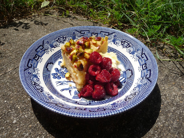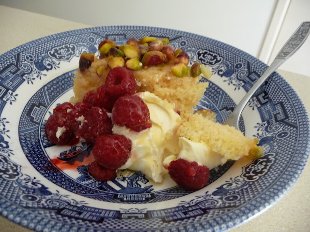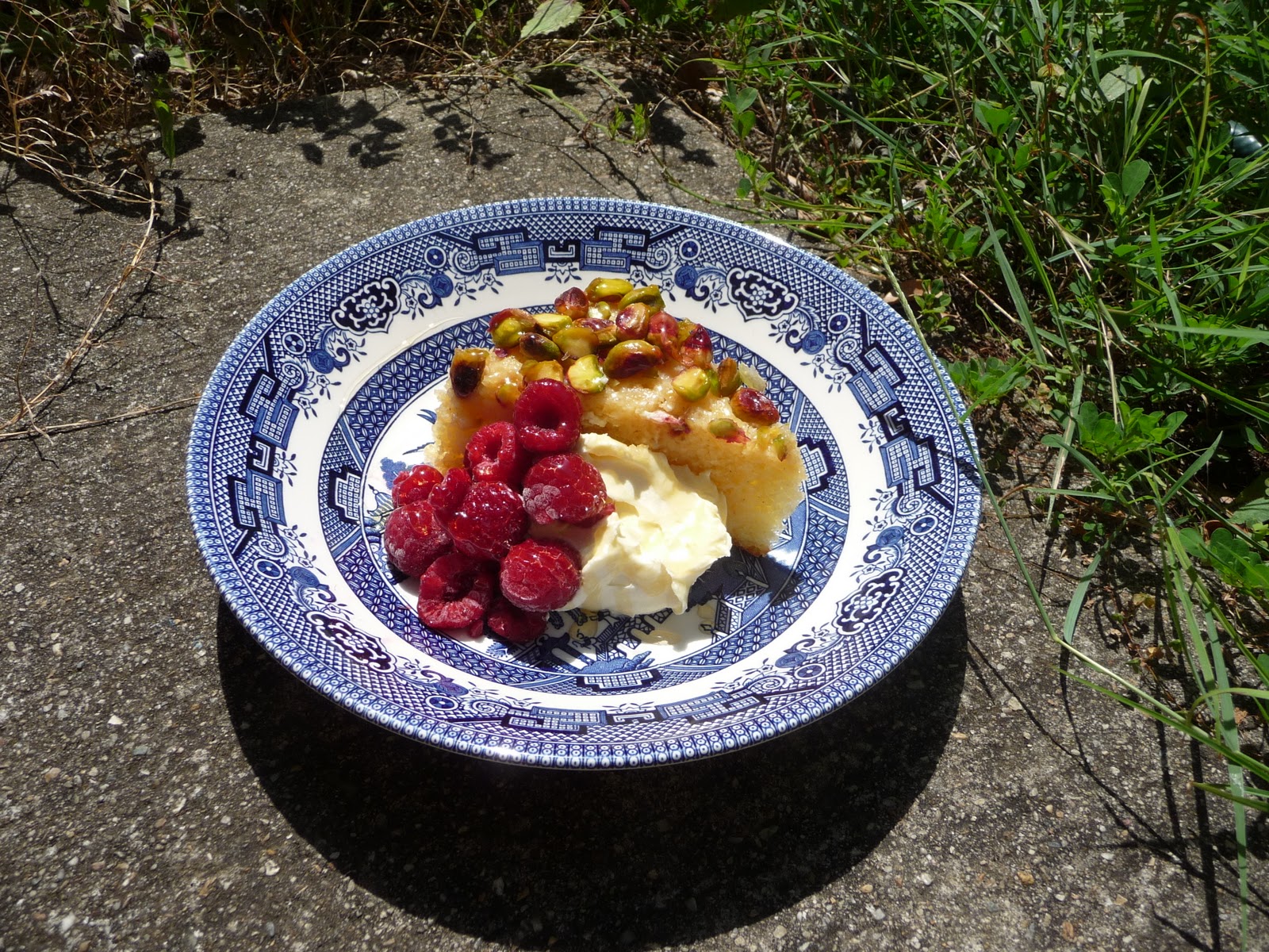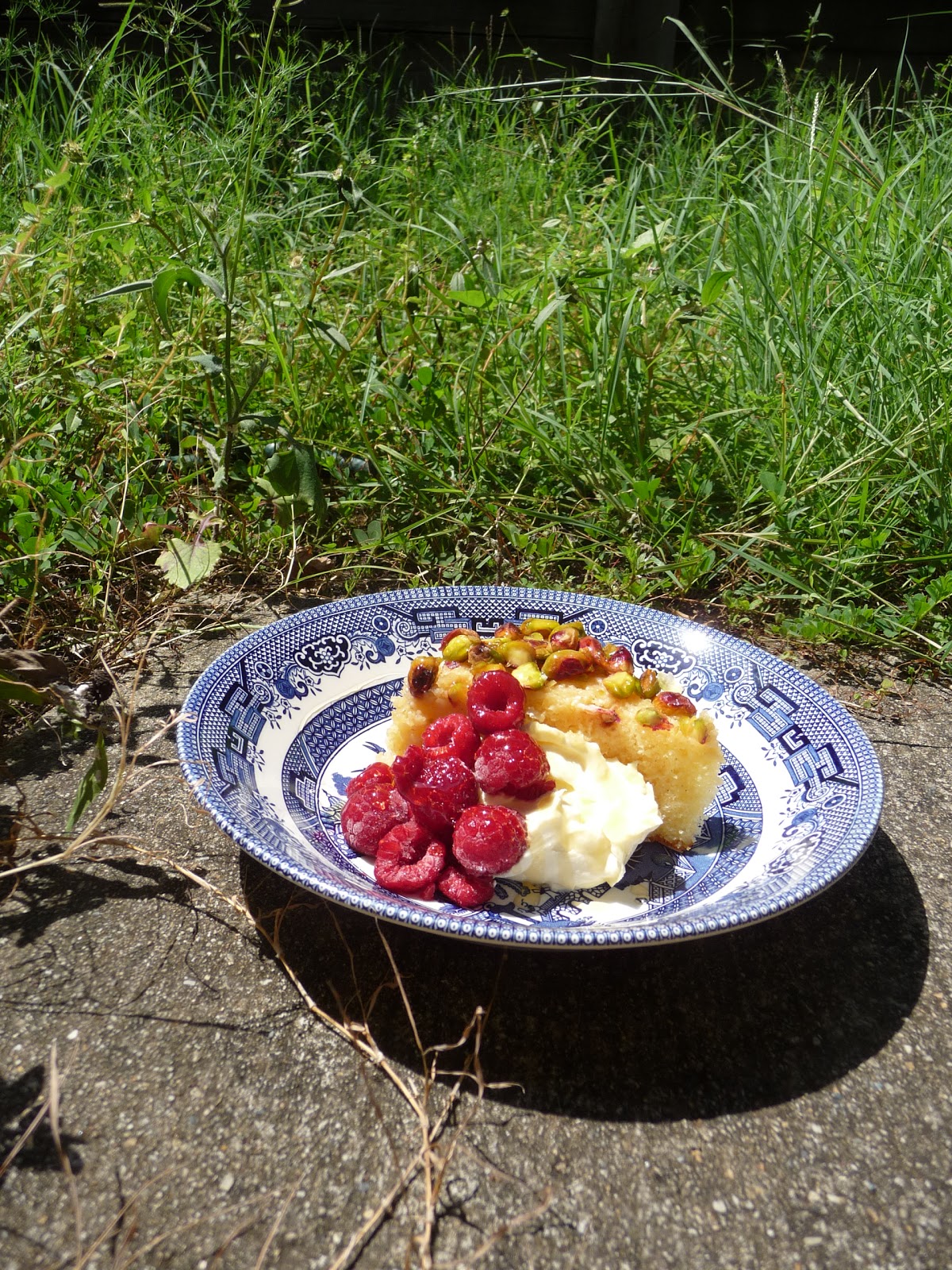 The cake itself is a fine specimen of a syrup cake. I worry when making a recipe using honey about whether or not it might be too sweet. But there is a good balance here of citrus and vanilla scented cake with the honey and lemon syrup and slightly bi?tter pistachio nuts. The cake is dense and moist from it’s syrup sousing, but the coarsely grained semolina and almond meal in the batter provide a loose textured crumb, and it is this which stops the cake from becoming a soggy mess. If you are a fan of a cup of tea with honey and lemon, as I am, then you will probably love this cake. Especially if you have the luxury, as I did, of having it with a pile of raspberries and strawberries, and a big dollop of King Island Pure Cream. This was devoured so fast at the end of my mum’s birthday celebration that it is not pictured here. Instead this is a piece that I stole, and served with just plain raspberries and mascarpone cream.