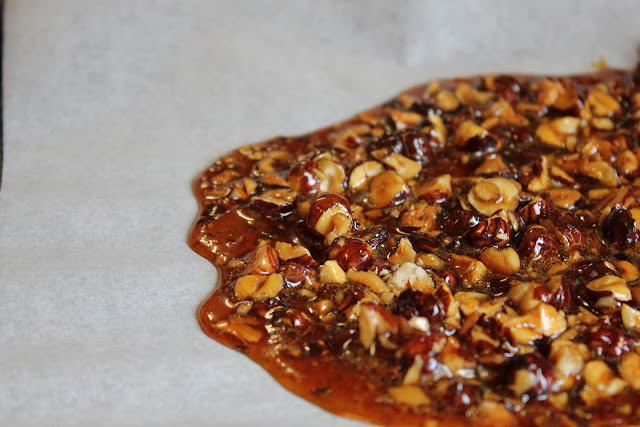 It’s like this; you get sugar and a touch of water and you boil ‘em up. Did I measure anything? Nope. Was there any strange chemical reaction that took place? Nope. Well, yes there was, but I didn’t understand it, still don’t and never will! Because it was EASY! Forget four ingredients, this is two ingredients. In fact, since no-one seems to count water as an ingredient (not sure why), that makes it one ingredient. And now you’ve got caramel. Praline is a mere chop, stir and a pour away.