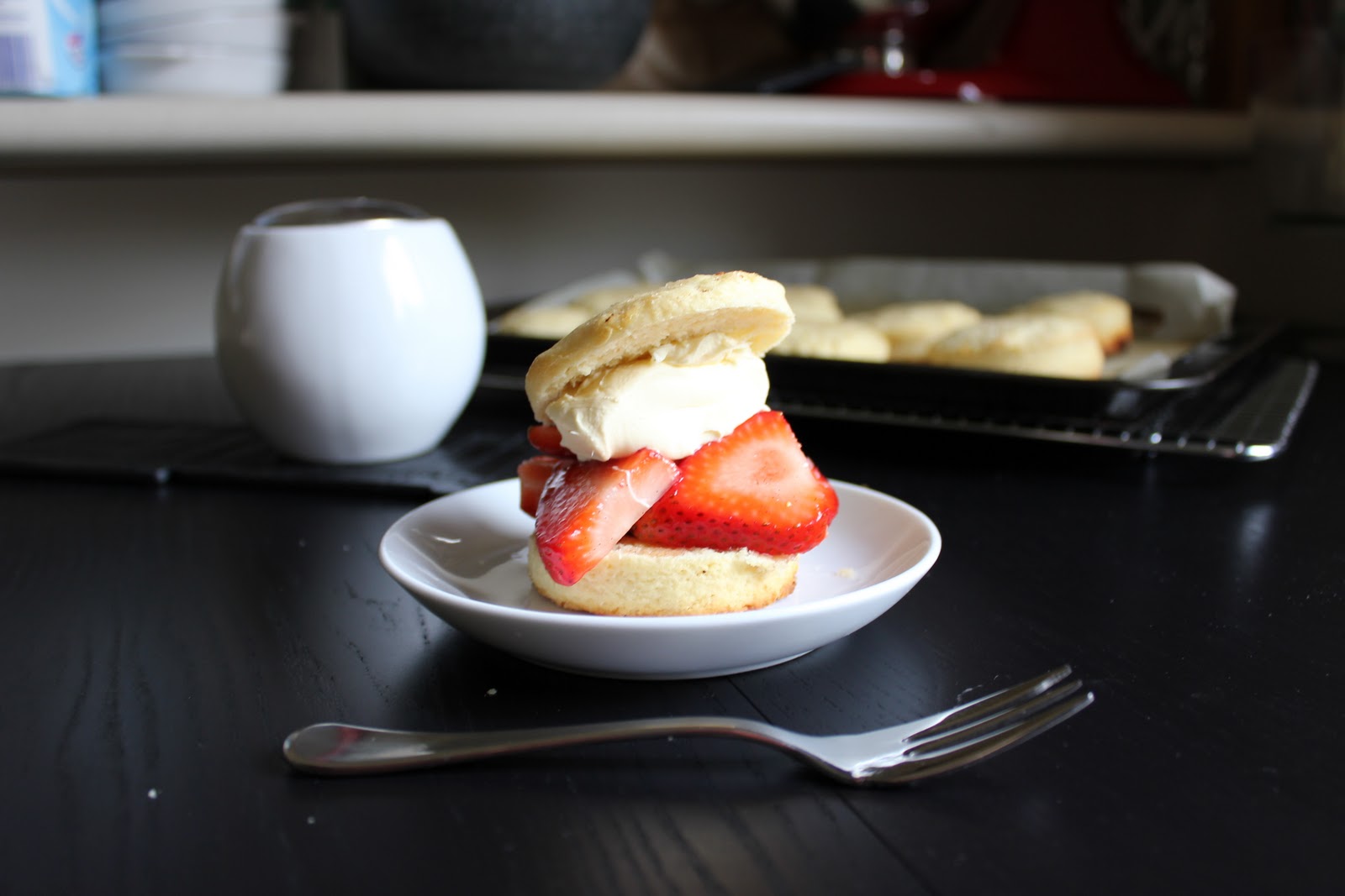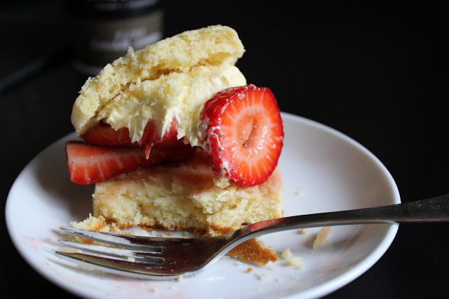 5. The shortcakes should be eaten while still warm, so split each one across the middle pile up some marinated strawberries on top, and add a dollop of thick double or clotted cream. I used some beautiful meander valley double cream. Yum!
