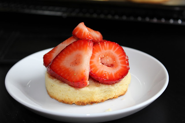 4. Bake for 10-15 minutes, until golden-brown. Meanwhile, slice up your strawberries, however irregularly you like, and sprinkle with 2 tsps of caster sugar and a dribble of vanilla bean paste, or extract.