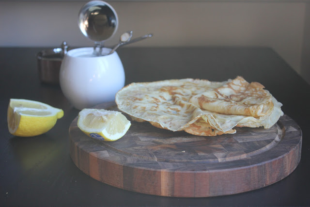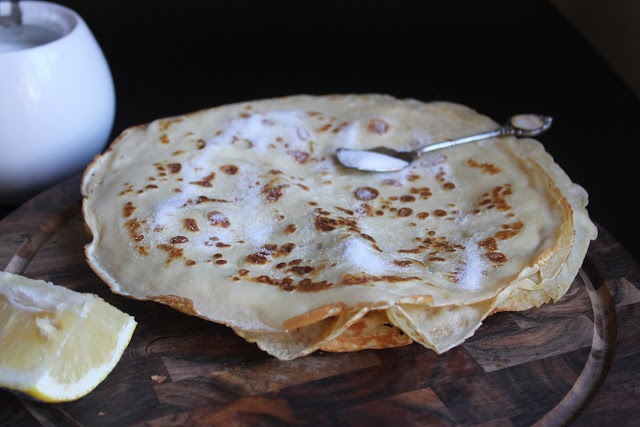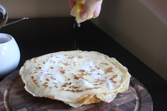 Heat a frying pan over medium heat, and melt about 1tsp butter in the pan. Ladle in about 1/4 cup of batter and swirl to coat the bottom of the pan. Cook on one side for around 1-2 minutes, flip and cook ont he second side for a further minute. Serve sprinkled with caster sugar and spritzed with lemon. Yum.